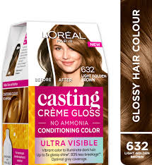 L'Oreal Paris Casting Creme Gloss Ultra Visible Hair Colour - Light Golden Brown 632 is an ammonia-free hair colour that gives your hair visible shimmering tones, glossy shine and covers greys. It gives you the richness of natural hair colour that lasts up to 28 shampoos. Casting Creme Gloss super-nourishing formula of caring conditioner leaves your hair nourished, soft, voluptuous.