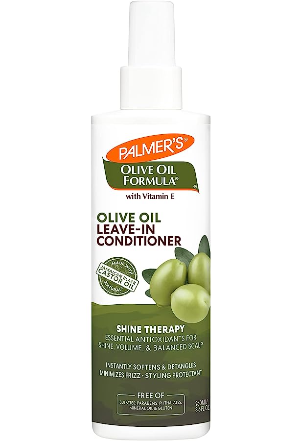 Nourishing moisture for healthy hair & scalp Instant spray-on, leave-in conditioner for use after shampooing. Detangler and heat protectant Formulated with extra virgin olive oil for highest concentration of vitamins and anti-oxidants. Helps smooth and repair rough, ragged hair strands for a deep, rich Instantly detangles and softens to reduce breakage Can be used on dry hair as a heat protectant spray Extra Virgin Olive Oil, Jamaican Black Castor Oil and Vitamin E. Palmer's Extra Virgin Olive Oil is Cold Pressed (ensures max quality). Surrounds hair shaft with anti-oxidant protection.